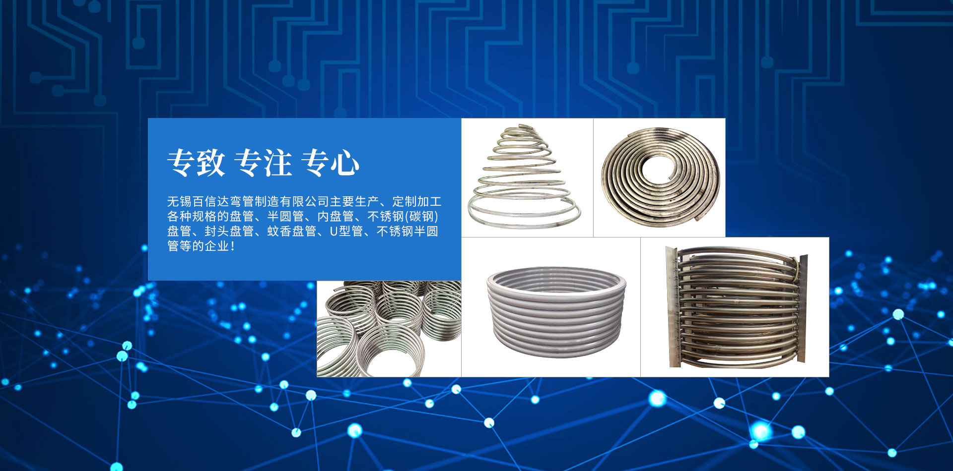 無(wú)錫百信達(dá)彎管制造有限公司位于經(jīng)濟(jì)發(fā)達(dá)、風(fēng)景秀麗的太湖之濱。本公司擁有完整、科學(xué)的質(zhì)量管理體系,公司的誠(chéng)信、實(shí)力和產(chǎn)品質(zhì)量獲得業(yè)界的認(rèn)可。公司專注生產(chǎn)、定制加工各種規(guī)格的盤(pán)管、半圓管、內(nèi)盤(pán)管、不銹鋼盤(pán)管、封頭盤(pán)管、蚊香盤(pán)管、U型管、不銹鋼半圓管、碳鋼盤(pán)管等的企業(yè)。本公司設(shè)計(jì)加工的彎管設(shè)備,質(zhì)量精良、結(jié)構(gòu)合理,效率高、操作簡(jiǎn)易、經(jīng)久耐用。公司已經(jīng)承接了各地多個(gè)大型場(chǎng)館工程項(xiàng)目的彎管加工,屢次得到了多家大客戶的好評(píng)。努力滿足客戶的需要,不斷提高自身水平是公司追求的目標(biāo)。歡迎社會(huì)各界朋友蒞臨無(wú)錫百信達(dá)彎管制造有限公司參觀、指導(dǎo)和業(yè)務(wù)洽談!